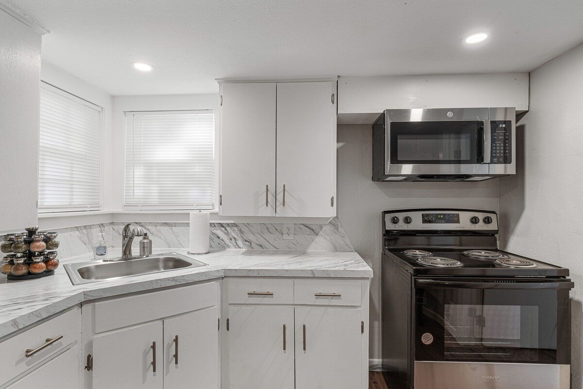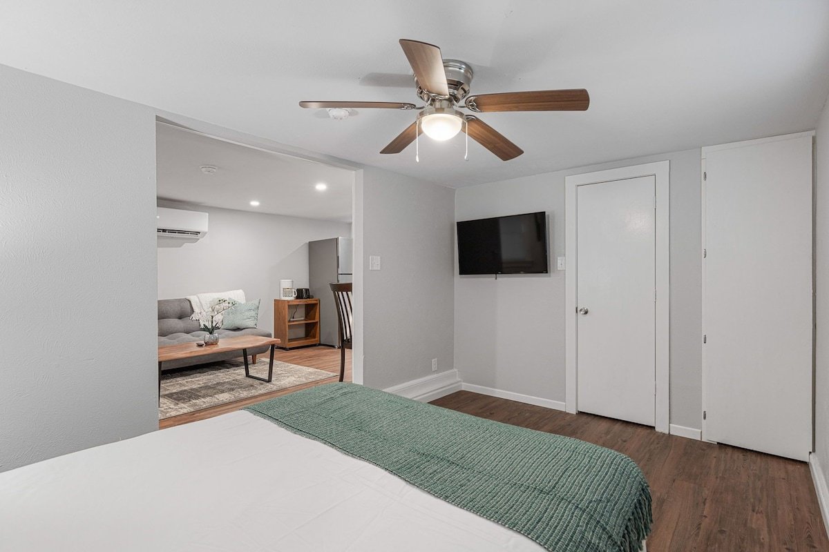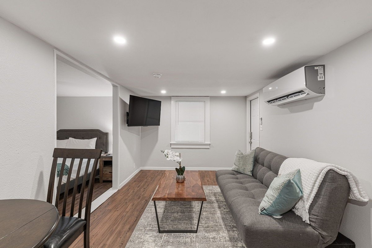 Enjoy a stylish experience at this centrally-located place. Everything inside this studio home is brand new. You have a futon couch that can sleep 2 in the living room and a Queen size bed in the bedroom each with their own TV. You also have a full kitchen and a washer and dryer inside your unit.The Smart lock on this property makes it easy to gain access at anytime you arrive and you enjoy the comfort of your covered parking space.