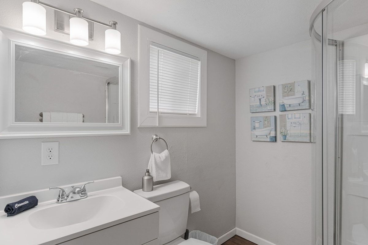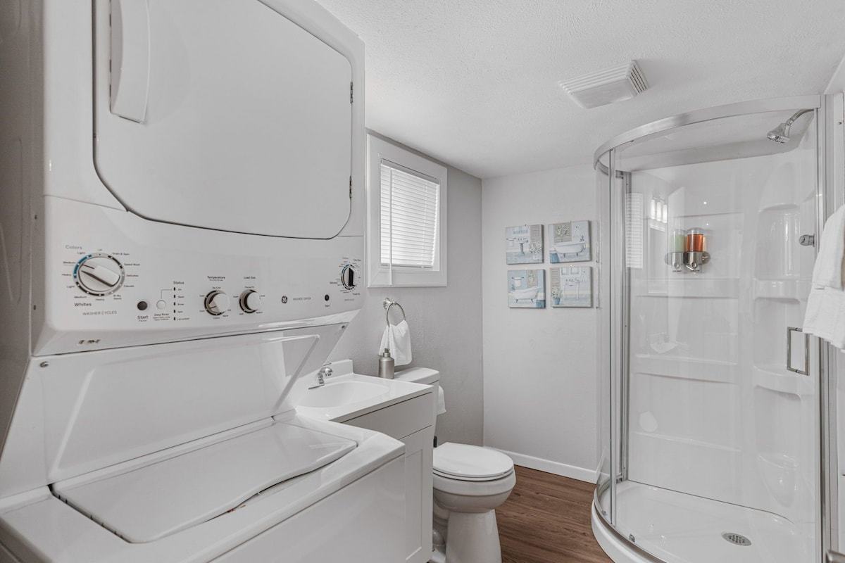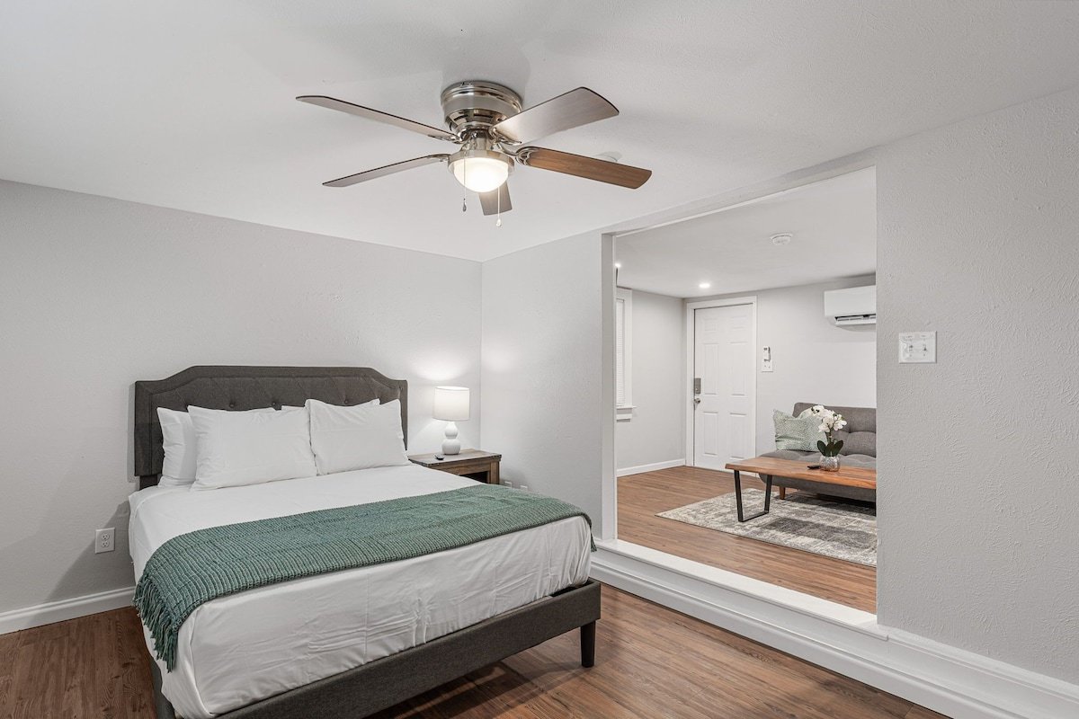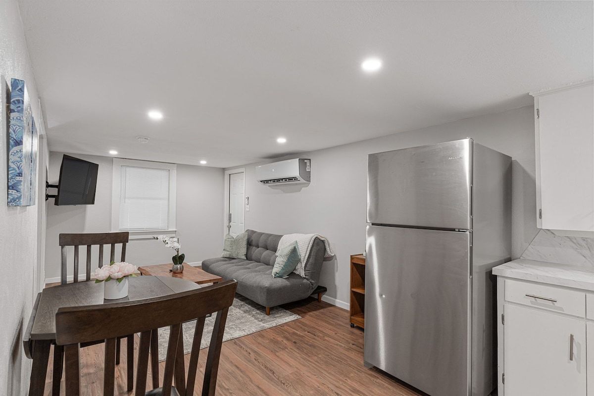 Enjoy a stylish experience at this centrally-located place. Everything inside this studio home is brand new. You have a futon couch that can sleep 2 in the living room and a Queen size bed in the bedroom each with their own TV. You also have a full kitchen and a washer and dryer inside your unit.The Smart lock on this property makes it easy to gain access at anytime you arrive and you enjoy the comfort of your covered parking space.